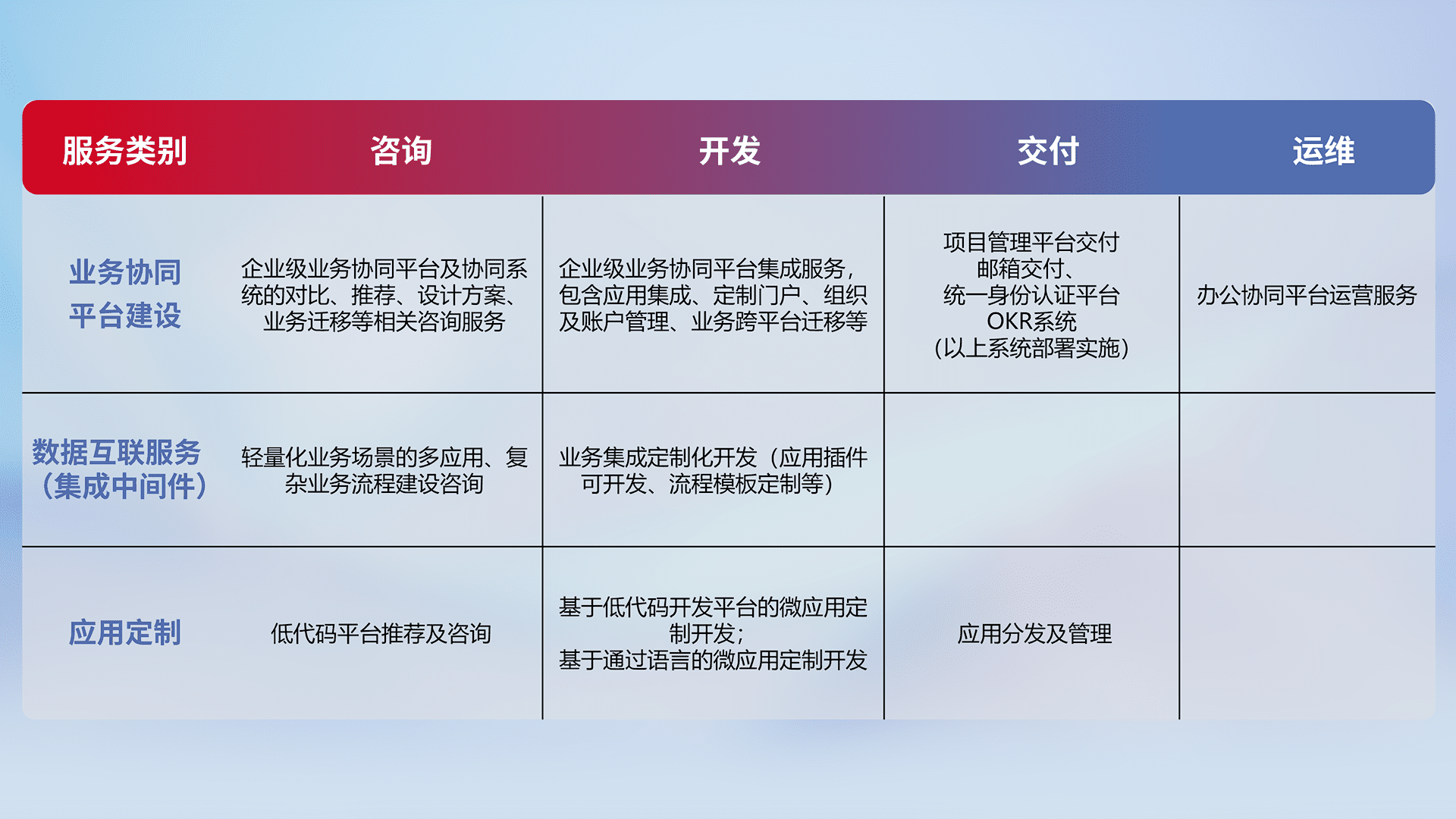 针对钉钉、、、企微、、、、IDaas等平台级产品提供产品的规划、、、、方案、、、、交付、、定制化开发等服务,,,,实现如统一协同办公、、、、智能客户服务、、、混合会议管理、、、智能数据查询、、、、等业务场景,,,实现数字化转型。。。